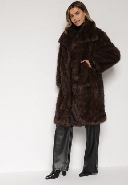 Brązowy Jednorzędowy Płaszcz Futro z Szerokim Kołnierzem Wedinalia