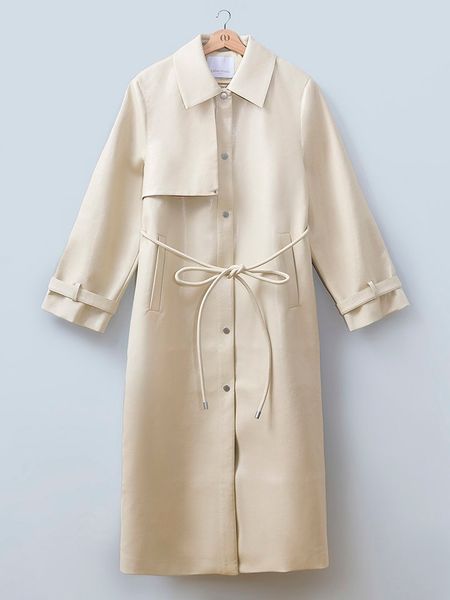 – kołnierz: kent- zapięcie: listwa guzikowa- kieszenie: wpuszczane- talia: wiązane tasiemki- krój: prosty- look: jednokolorowy
