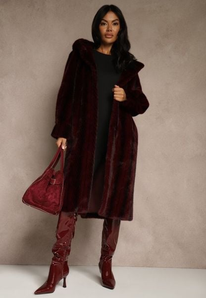 Bordowy Futrzany Płaszcz z Kapturem Zdobiony Pionowym Wzorem Elrinrahne