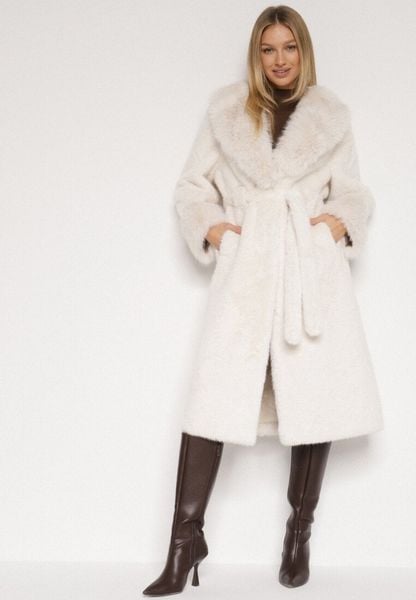 Biały Futrzany Płaszcz z Wiązanym Paskiem Ozdobnym Kołnierzem i Mankietami Viaressa