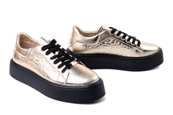 Złote Ażurowe Półbuty Metaliczne na Niskim Koturnie ze Skórzaną Wkładką Marailena