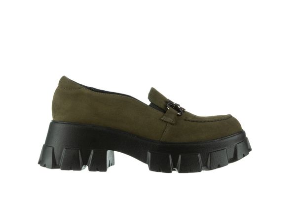 Półbuty marki Bayla wykonane z naturalnej skóry zamszowej w kolorze zielonym. Wkładka oraz wyściółka ze skóry naturalnej w kolorze czarnym. Model na wygodnej, topornej podeszwie, która w najwyższym miejscu ma 6 cm. Obuwie wsuwane. Klasyczna cholewka o prostym kształcie. Najmodniejszy w tym sezonie „ciężki” look uzyskany dzięki mocnej, traktorkowej podeszwie. Z przodu cholewki wszyte gumki […]