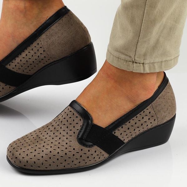 Półbuty damskie na koturnie:są pełnowartościowe w I gatunkusą starannie wykonane oraz odznaczają się wysoką trwałościąmaja stabilną podeszwęwysokość całkowita: 10.5 cm, obcas: 4.5 cm, spód: 0.8 cm Kolor: Szary zamsz (fango) GWARANCJA na 12 miesięcy