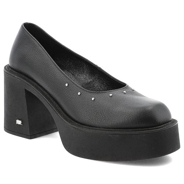 Półbuty damskie Karino, na wysokim klocku eleganckie skórzane z dżetami wsuwane z okrągłym noskiem, czarne licowe, 5648-126-P