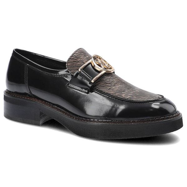 Półbuty damskie Karino, naturalna skóra licowa o lakierowanym wykończeniu z fakturowaną wstawką na podbiciu metalową aplikacją oraz solidną podeszwą,