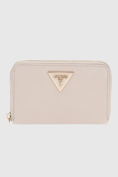 Biały portfel damski marki Guess, wykonany ze skóry ekologicznej. Zamykany na zamek, posiada wewnętrzną kieszeń na bilon, dwie przegrody, cztery miejsca na karty i dwie kieszenie wsuwane.