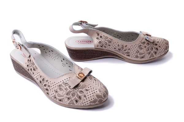 Sandały damskie. Naturalna skóra. Ażurowa cholewka. Miękka wkładka. Zapięcie na klamerkę. Guma ściągająca. Wygodny koturn. Tęgość G. Linia Lanqier Comfort.
