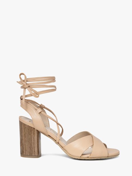 Beżowe sandały na słupku z wiązaniem wokół kostki