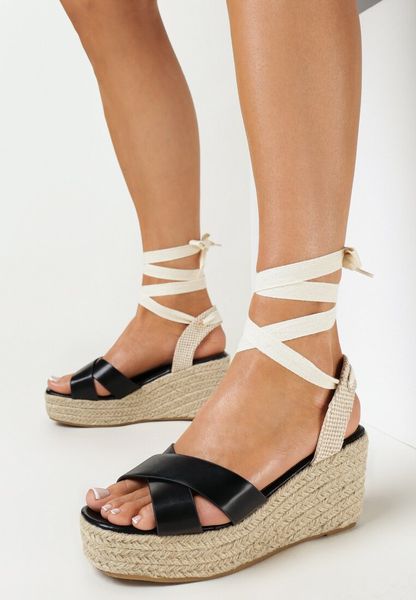 Czarne Sandały na Koturnie z Plecionki i Wiązaniem wokół Kostki Maevisa