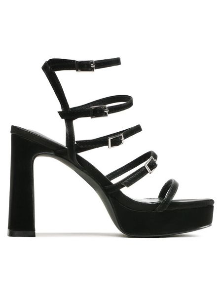 Czarne Sandały z Ekozamszu na Niskim Słupku o Ażurowym Wykończeniu z Ozdobnymi Nitami Panessi