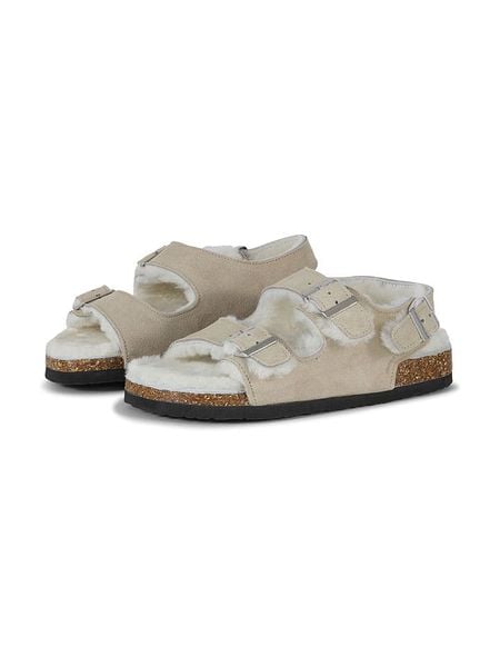 – zapięcie: sprzączka- noski: otwarte- pasek: skóra- miękka wyściółka z owczej skóry- podeszwa: antypoślizgowa