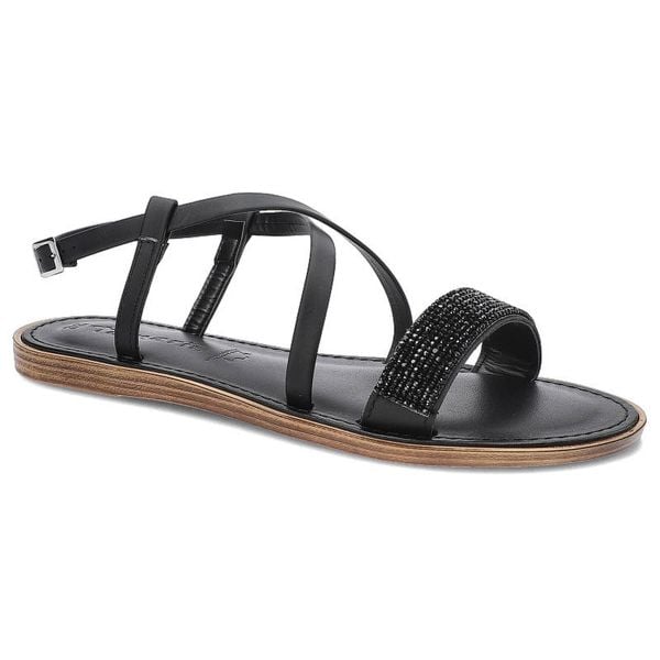 Sandały damskie Tamaris, z cienkimi paskami zapinanymi na sprzączkę ozdobnym paskiem z drobnymi aplikacjami oraz płaską warstwową podeszwą, czarne, 1