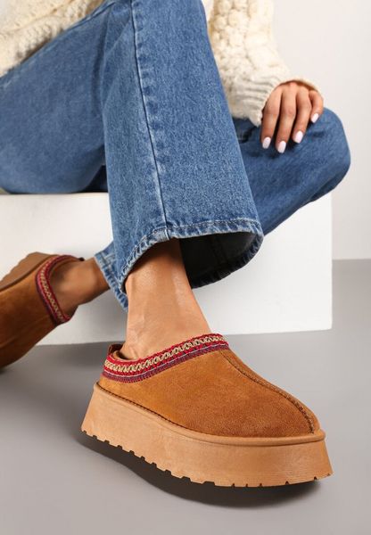 Brązowe Śniegowce z Ekozamszu na Platformie z Niską Cholewką z Ozdobnym Haftem Garvia