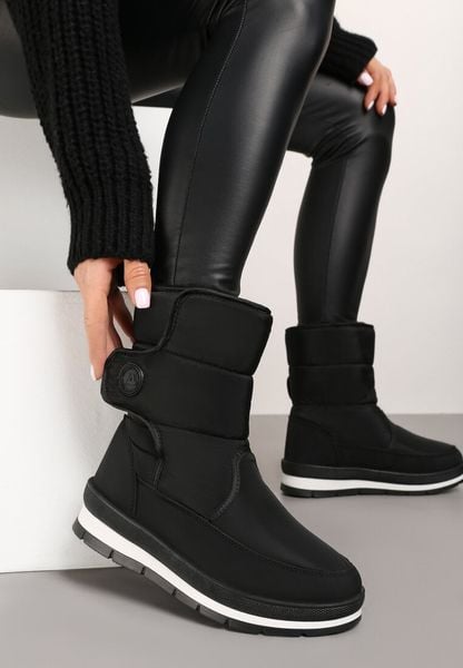 Czarne Pikowane Śniegowce na Płaskiej Podeszwie Ozdobione Aplikacją Niathra