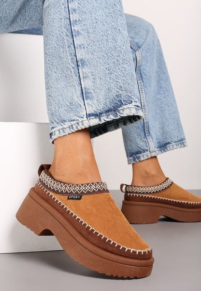 Brązowe Śniegowce z Ekozamszu na Platformie z Niską Cholewką z Ozdobnym Haftem Garvia