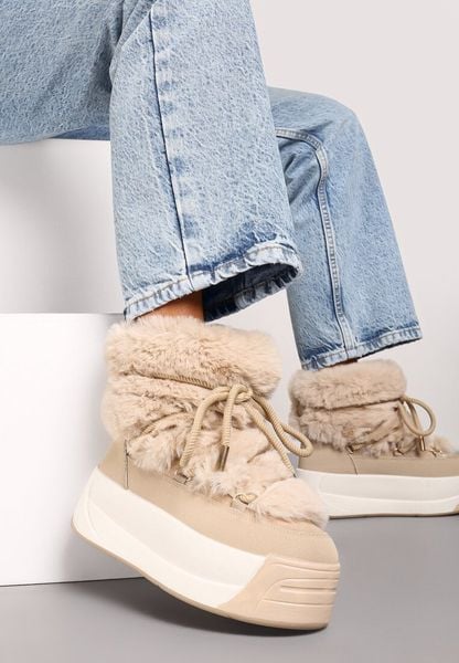 Ciemnobeżowe Wsuwane Śniegowce na Platformie z Futerkiem i Sznurowaniem Ettarie
