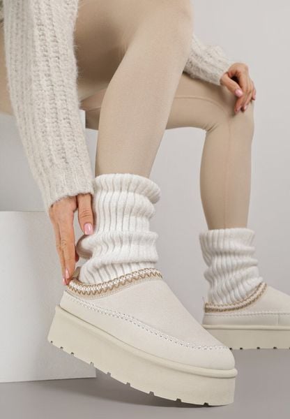 Beżowe Śniegowce Ocieplone na Platformie z Ozdobnym Wyszywaniem Reitenna