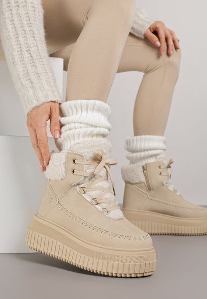 Ciemnobeżowe Wsuwane Śniegowce na Platformie z Futerkiem i Sznurowaniem Ettarie