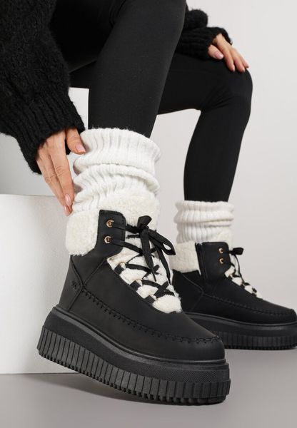 Czarne Śniegowce na Grubej Tłoczonej Platformie z Futerkiem i Przeszyciami Emirio