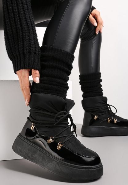 Czarne Wsuwane Śniegowce Ocieplone z Ozdobnym Wiązaniem Wokół Cholewki na Platformie Bebrra