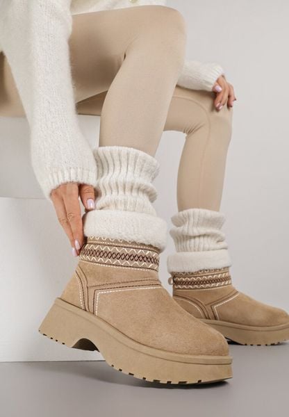 Ciemnobeżowe Krótkie Śniegowce Wsuwane z Haftem i Futerkiem przy Cholewce Miovadia