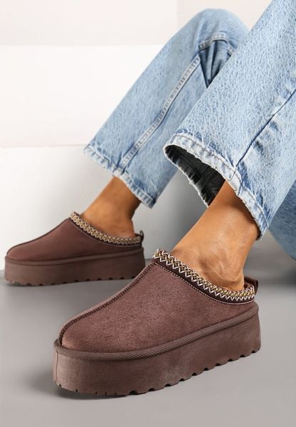 Brązowe Śniegowce z Ekozamszu na Platformie z Niską Cholewką z Ozdobnym Haftem Garvia
