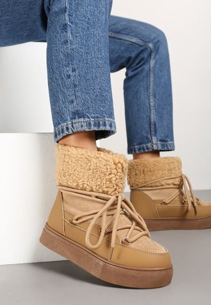 Beżowe Śniegowce na Platformie ze Sznurowaną Cholewką i Futrzanymi Wstawkami Tilimara
