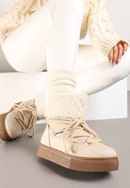 Beżowe Śniegowce na Płaskiej Podeszwie ze Sznurowaniem i Futerkiem Typu Baranek Salabira