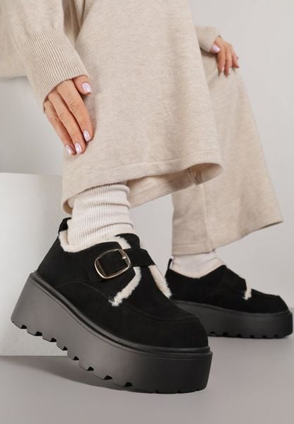 Czarne Śniegowce na Grubej Podeszwie z Paskiem z Klamerką i Futerkiem Uwedina