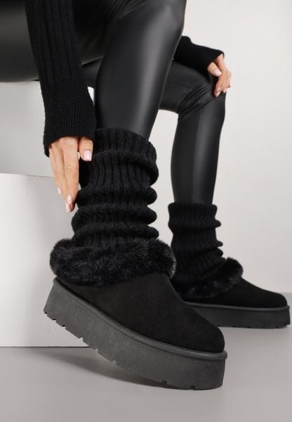 Czarne Śniegowce na Platformie Ozdobione Futerkiem i Paskiem na Pięcie Inarine