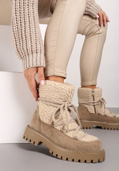 Ciemnobeżowe Śniegowce na Grubej Podeszwie z Futerkiem i Przeszciami Linafra