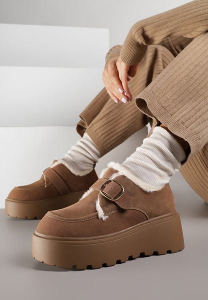 Jasnobrązowe Śniegowce na Grubej Podeszwie z Paskiem z Klamerką i Futerkiem Uwedina