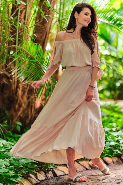 Zwiewna Maxi Spódnica z Falbaną – Beżowa