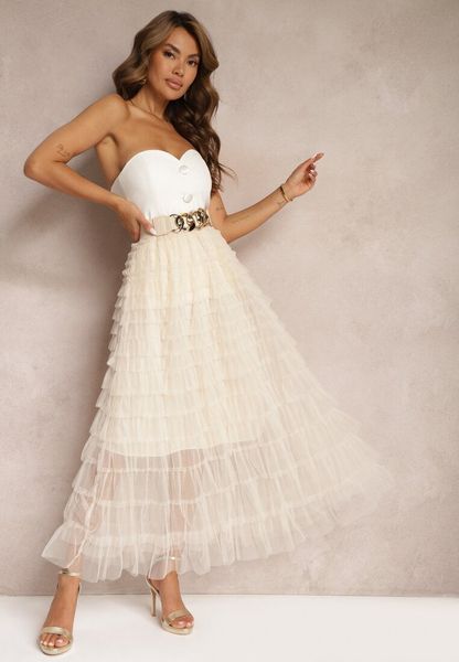 Jasnobeżowa Rozkloszowana Spódnica Maxi z Gumką w Talii i Falbanami z Tiulu Estime