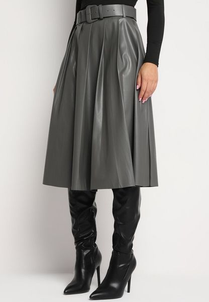 Szara Rozkloszowana Spódnica Preppy Plisowana z Wysokim Stanem z Ekoskóry z Paskiem Irivale
