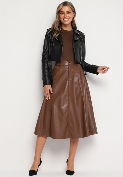 Brązowa Spódnica z Ekoskóry o Rozkloszowanym Kroju z Wysokim Stanem Evidas