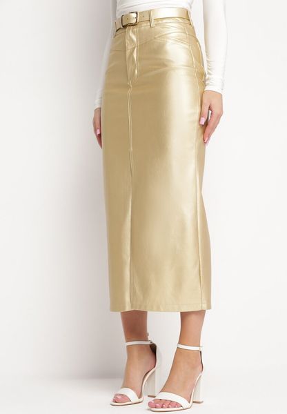 Złota Spódnica Maxi z Ekoskóry o Ołówkowym Kroju z Rozcięciem Jile