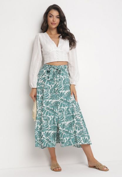 Biało-Zielona Spódnica Maxi z Wiskozy z Gumką w Talii i Plecionym Paskiem Favemi