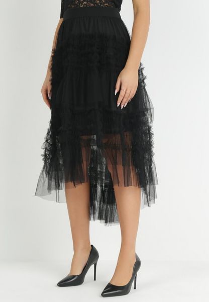 Czarna Rozkloszowana Spódnica z Transparentnej Tkaniny Ozdobiona Falbanką Ninafri