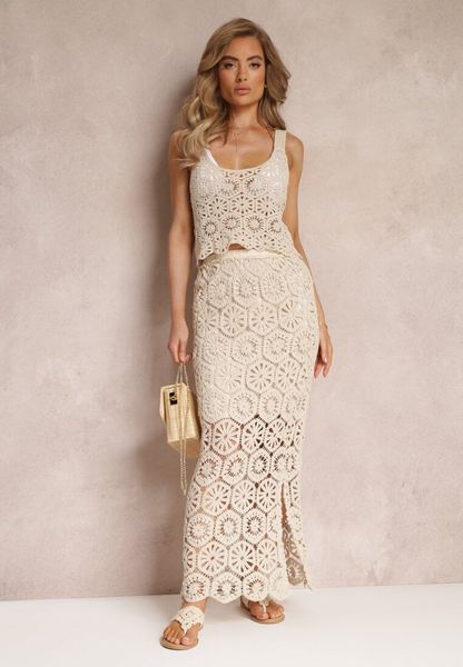 Beżowa Spódnica Maxi z Szydełkowej Tkaniny Jeslira