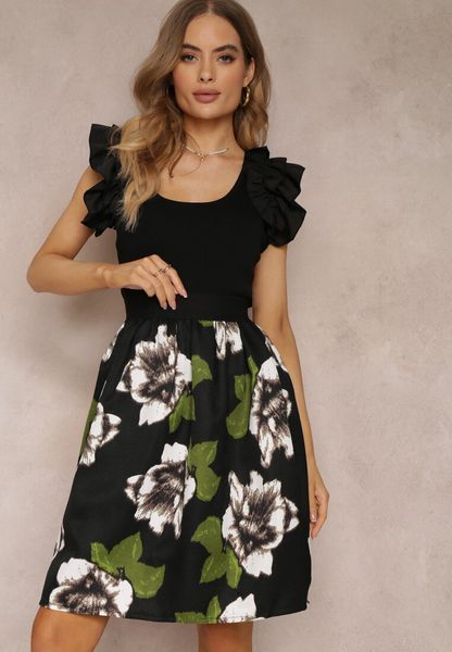 Czarna Wiskozowa Spódnica w Kwiaty o Rozkloszowanym Kroju z Wiązanym Paskiem Levinda