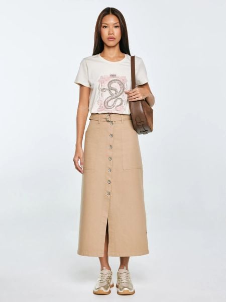 Spódnica damska midi z dodatkiem lnu z ozdobnymi guzikami beżowa Anesa 805