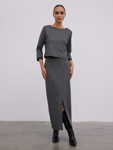 – zapięcie: suwak – dolny brzeg: z rozcięciem- krój: prosty – wzór: pepitka
