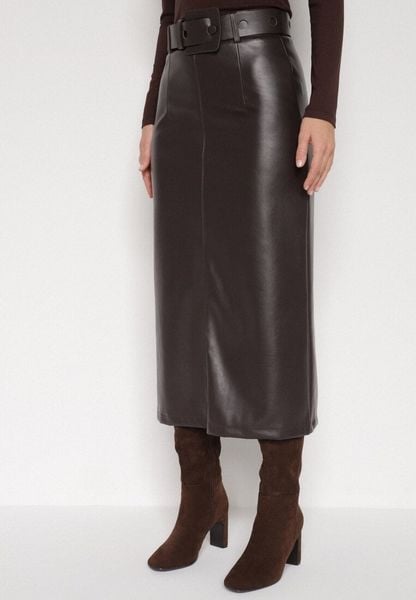 Brązowa Spódnica Ołówkowa High Waist z Imitacji Skóry Ozdobiona Paskiem Norinka