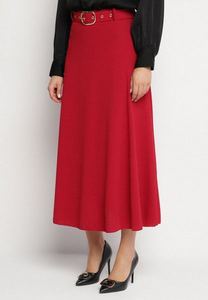 Bordowa Rozkloszowana Spódnica z Wiskozą Ozdobiona Paskiem i Plisami Fidelin