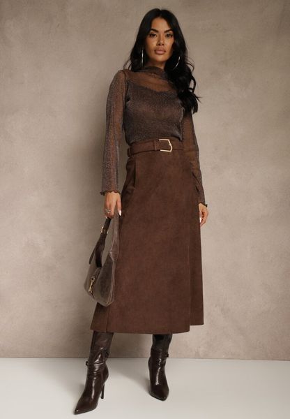 Brązowa Spódnica z Wiskozy z Bawełną z Imitacji Zamszu z Paskiem Oliweda