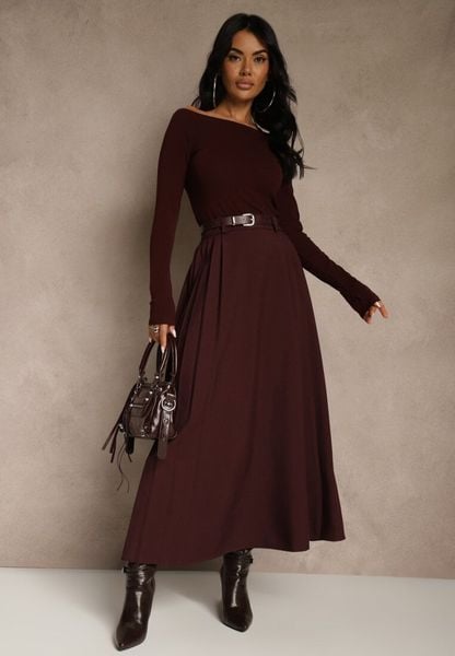 Bordowa Rozkloszowana Spódnica z Wiskozą Ozdobiona Paskiem i Plisami Fidelin