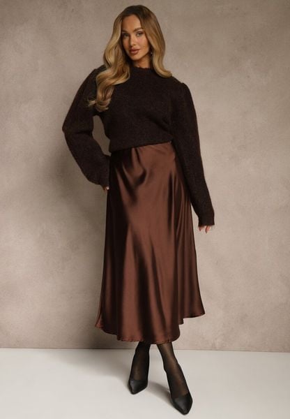 Brązowa Satynowa Midi Spódnica Rozkloszowana z Gumką w Pasie i Suwakiem Leose