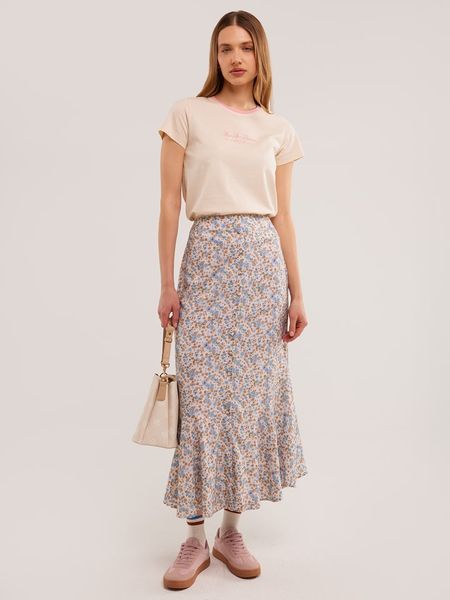 – czysta wiskoza- wysokość pasa: high waist- pas / ściągacz: elastyczny- zapięcie: listwa guzikowa- krój: litera A- dolny brzeg: z falbankami- wzór: na całości