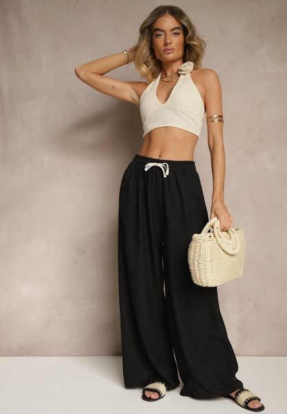 Czarne Spodnie z Bawełną o Szerokim Kroju High Waist z Wiązaniem Noleldi